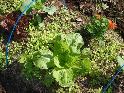 白菜、レタス、キャベツ、マリーゴールド。 の根元には春菊や山東菜などの若芽がたくさん。 この子たちは脇役ですが、 雑草を抑える、土の保温・保湿、 ミネラルや微生物のバランスを整えるなど、 いろんな役割を果たしています。 自然農では雑草にこの役目…